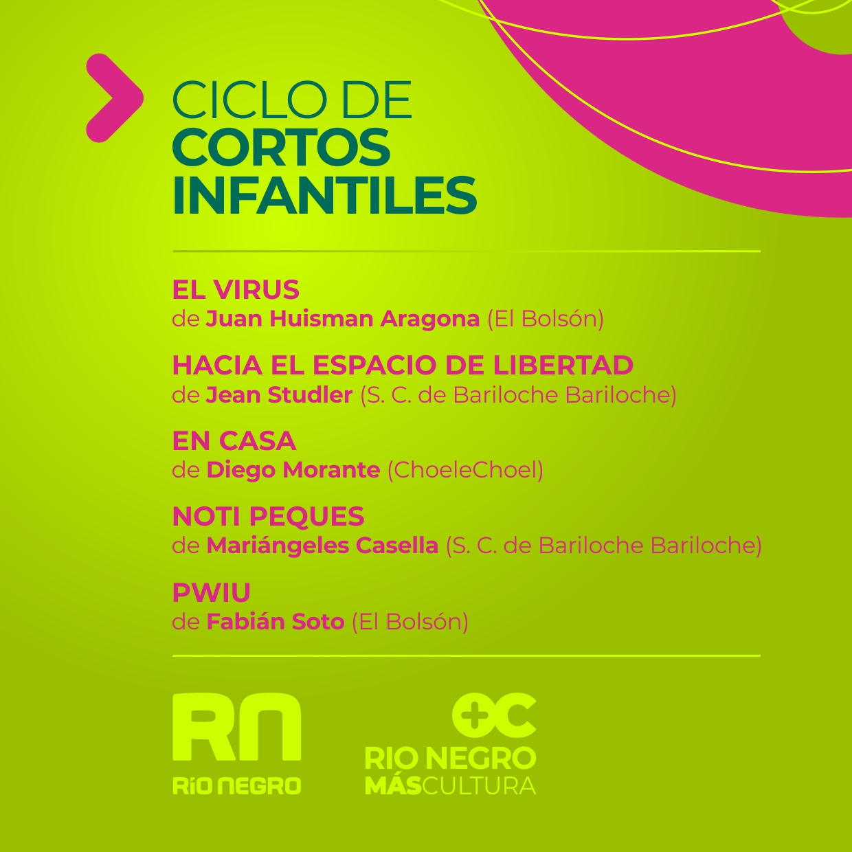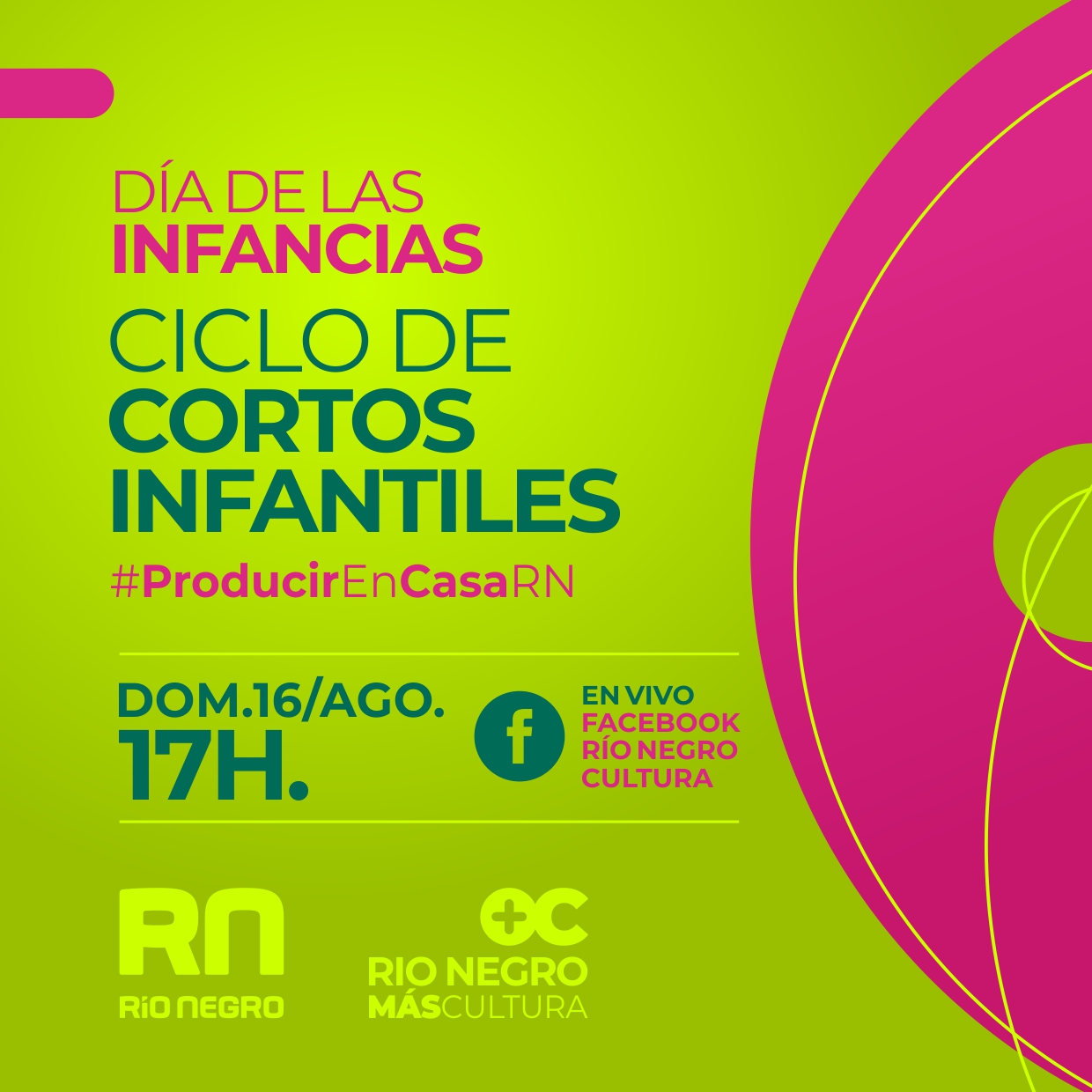 Una hora más tarde, también en el Facebook de Río Negro Cultura y el canal de Youtube del Ministerio de Turismo, Cultura y Deporte, se podrán apreciar producciones audiovisuales seleccionadas de #ProducirEnCasaRN en la sección infantil.